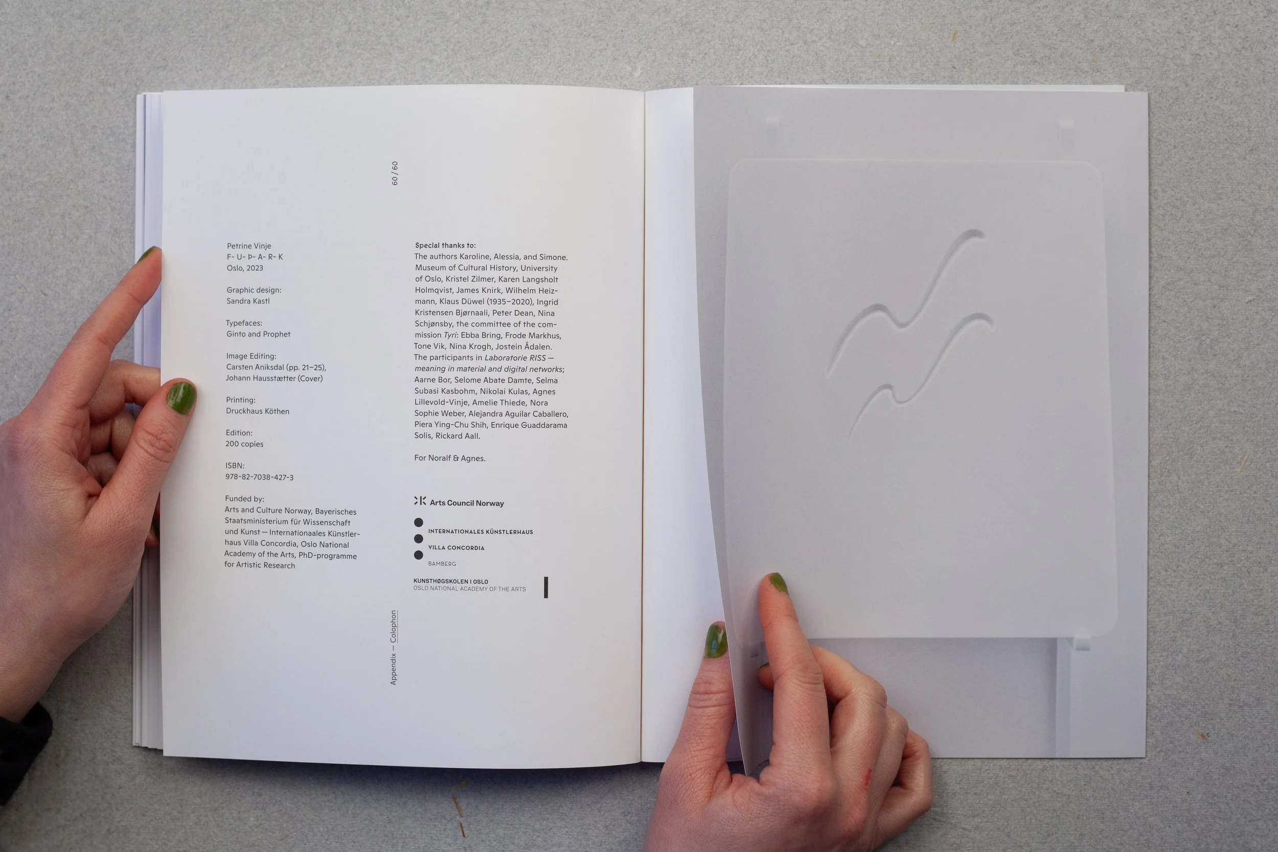 The publication applies a broad contextual framework and explores the way links arise between the past, present and future as a result of the three-way relationship between technology, meaning-making, and materiality. Of central importance are the artistic processes, which feed on, enrich, and add new symbols, words, and images to the flow of meaning between people and their co-creators. It tells a story about artistic research and how an objective material transforms into poetic material with links to the artists subjective voice.